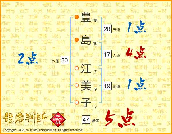 豊(18画)島(10画) 江(7画)美(9画)子(3画)