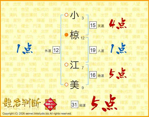 生活面を象徴する運勢です。外部から受ける影響力を表し、結婚運、家庭運や職場、環境への順応性を表します。総運から人運を引いた画数。姓や名が1文字の場合を除く。