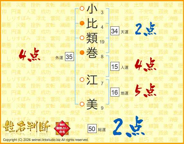 小(3画)比(4画)類(19画)巻(8画) 江(7画)美(9画)