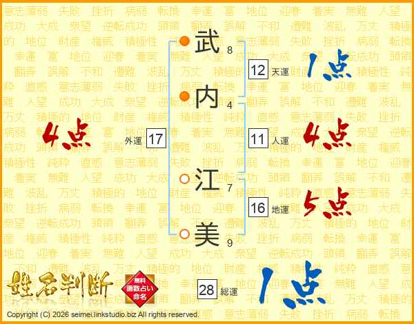 武(8画)内(4画) 江(7画)美(9画)