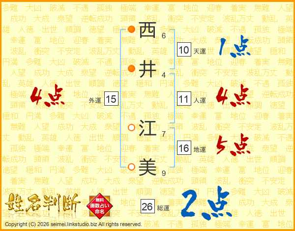 生活面を象徴する運勢です。外部から受ける影響力を表し、結婚運、家庭運や職場、環境への順応性を表します。総運から人運を引いた画数。姓や名が1文字の場合を除く。