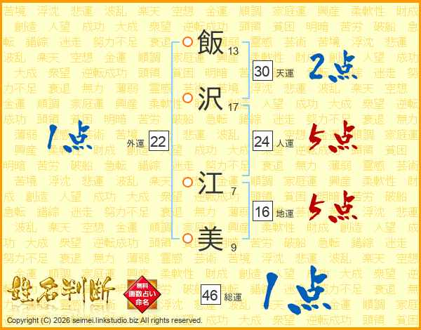 飯(13画)沢(17画) 江(7画)美(9画)