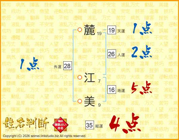 生活面を象徴する運勢です。外部から受ける影響力を表し、結婚運、家庭運や職場、環境への順応性を表します。総運から人運を引いた画数。姓や名が1文字の場合を除く。