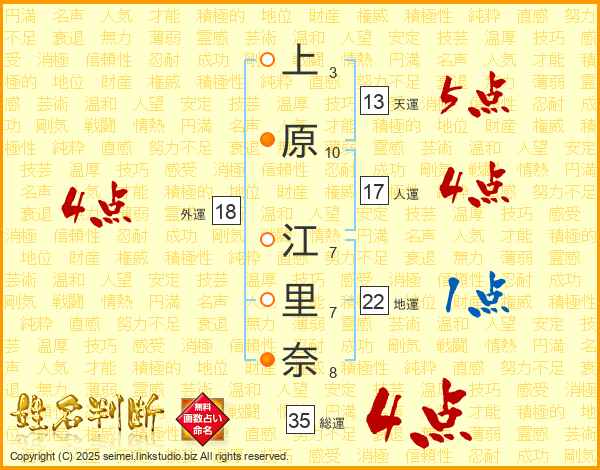 上(3画)原(10画) 江(7画)里(7画)奈(8画)