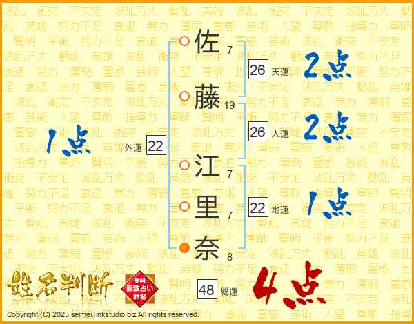 佐(7画)藤(19画) 江(7画)里(7画)奈(8画)