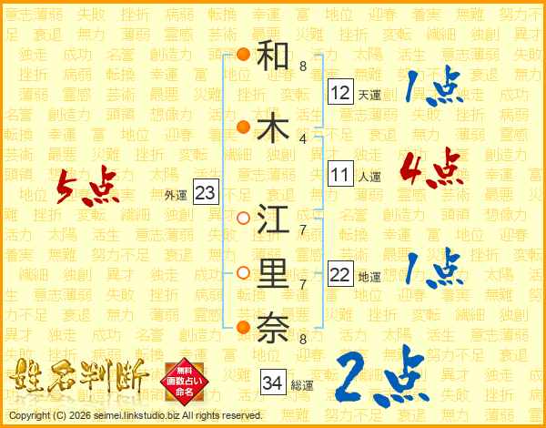 和(8画)木(4画) 江(7画)里(7画)奈(8画)