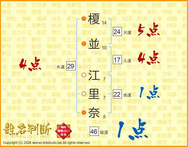 榎(14画)並(10画) 江(7画)里(7画)奈(8画)