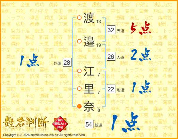 渡(13画)邉(19画) 江(7画)里(7画)奈(8画)