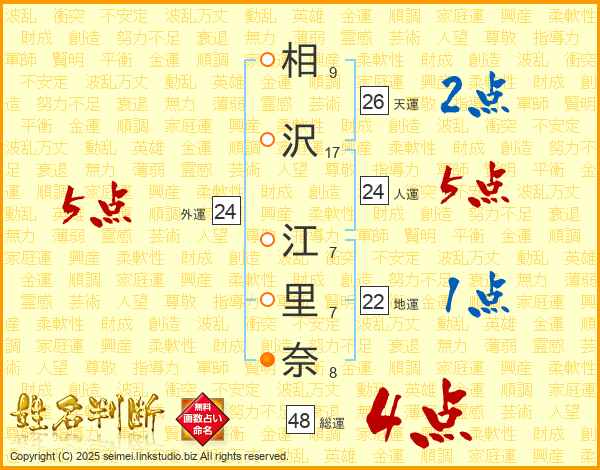 相(9画)沢(17画) 江(7画)里(7画)奈(8画)