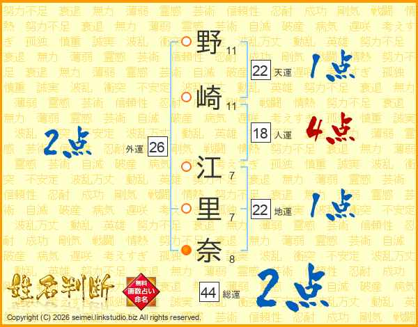 野(11画)崎(11画) 江(7画)里(7画)奈(8画)