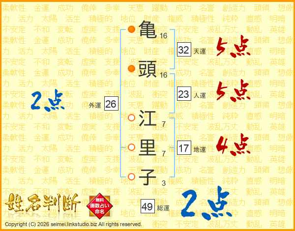 亀頭江里子さんの外運は26画の2点!