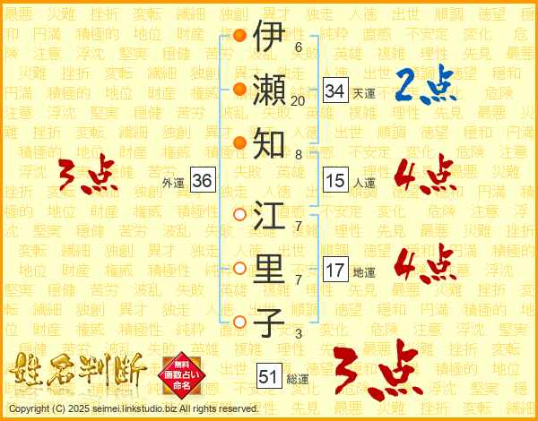 伊(6画)瀬(20画)知(8画) 江(7画)里(7画)子(3画)