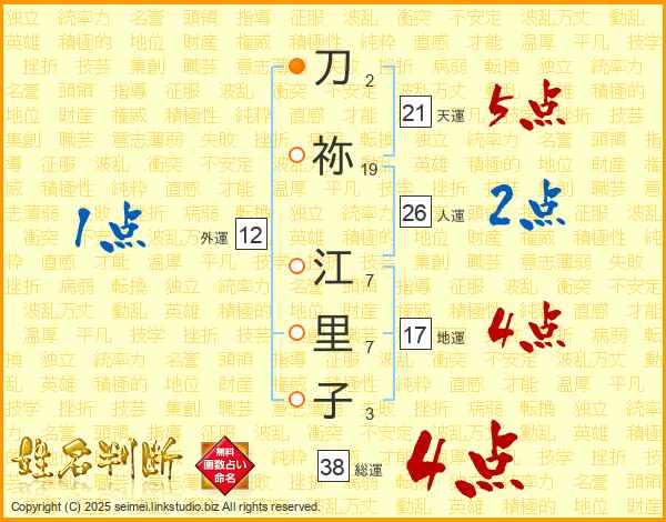 刀(2画)祢(19画) 江(7画)里(7画)子(3画)