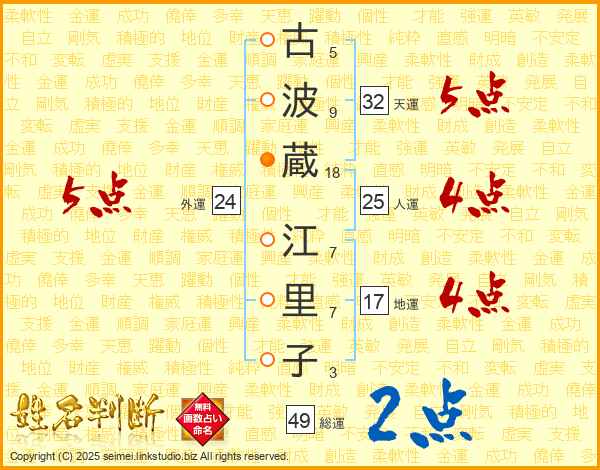 古(5画)波(9画)蔵(18画) 江(7画)里(7画)子(3画)