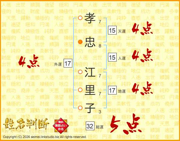 孝忠江里子さんの総運は32画の5点!