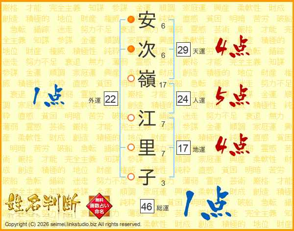 安(6画)次(6画)嶺(17画) 江(7画)里(7画)子(3画)