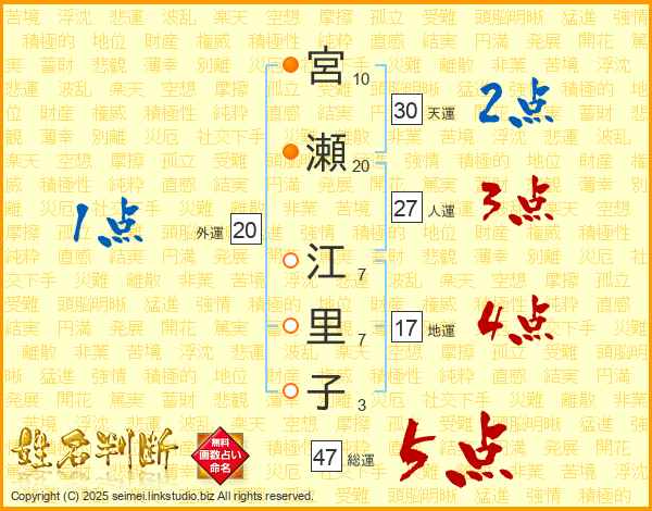 宮(10画)瀬(20画) 江(7画)里(7画)子(3画)