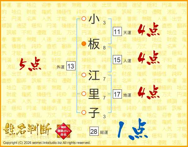 生活面を象徴する運勢です。外部から受ける影響力を表し、結婚運、家庭運や職場、環境への順応性を表します。総運から人運を引いた画数。姓や名が1文字の場合を除く。