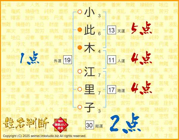 小(3画)此(6画)木(4画) 江(7画)里(7画)子(3画)