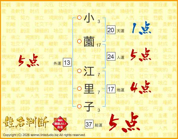 小(3画)薗(17画) 江(7画)里(7画)子(3画)