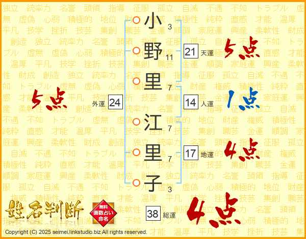 小(3画)野(11画)里(7画) 江(7画)里(7画)子(3画)