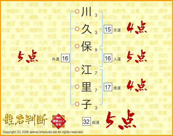 川(3画)久(3画)保(9画) 江(7画)里(7画)子(3画)