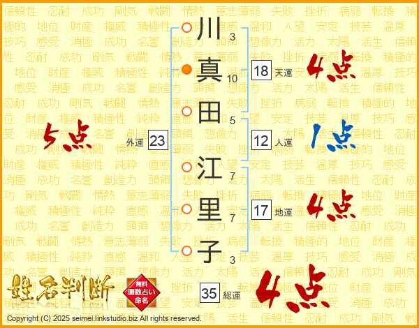 川(3画)真(10画)田(5画) 江(7画)里(7画)子(3画)