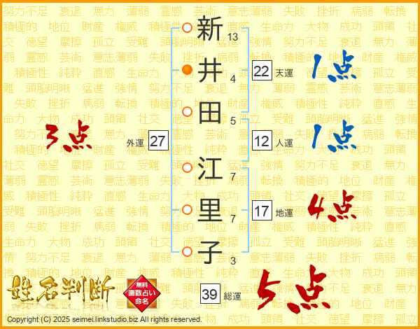 新(13画)井(4画)田(5画) 江(7画)里(7画)子(3画)