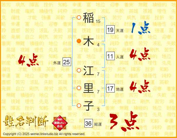 稲(15画)木(4画) 江(7画)里(7画)子(3画)