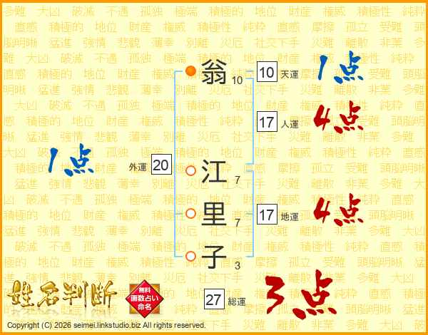 生活面を象徴する運勢です。外部から受ける影響力を表し、結婚運、家庭運や職場、環境への順応性を表します。総運から人運を引いた画数。姓や名が1文字の場合を除く。