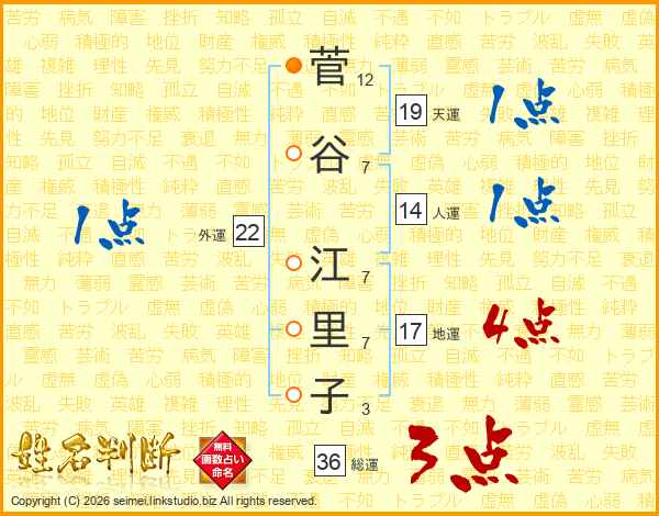 菅(12画)谷(7画) 江(7画)里(7画)子(3画)
