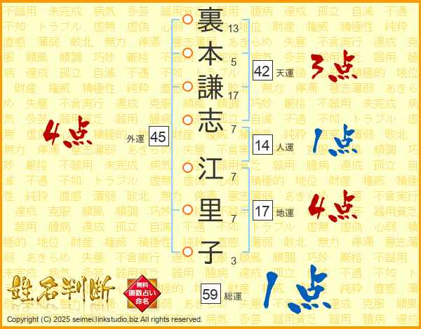 裏(13画)本(5画)謙(17画)志(7画) 江(7画)里(7画)子(3画)