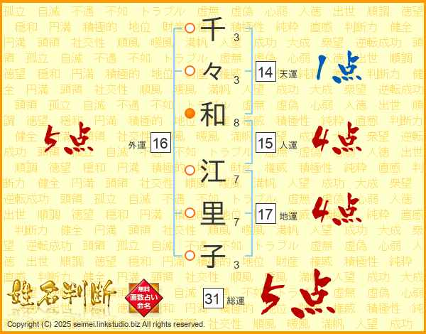 千(3画)々(3画)和(8画) 江(7画)里(7画)子(3画)