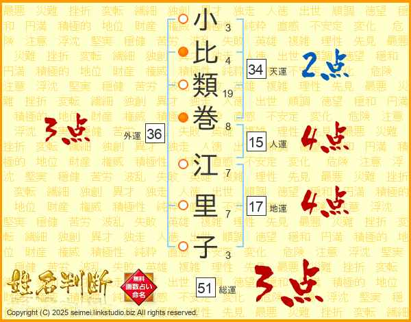小(3画)比(4画)類(19画)巻(8画) 江(7画)里(7画)子(3画)