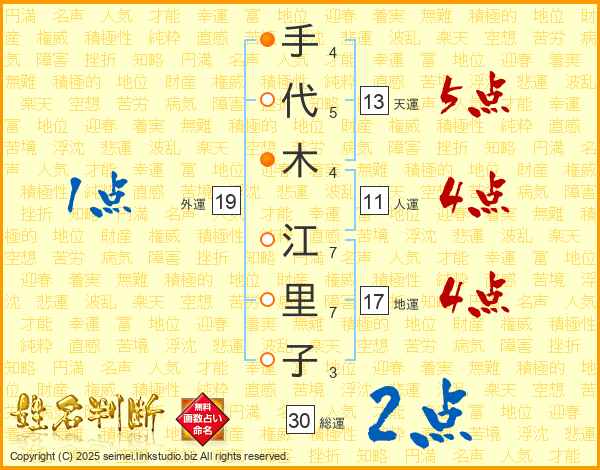 手(4画)代(5画)木(4画) 江(7画)里(7画)子(3画)