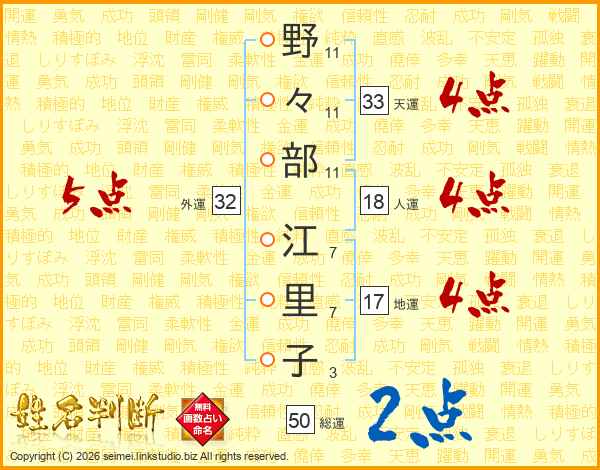 野(11画)々(11画)部(11画) 江(7画)里(7画)子(3画)