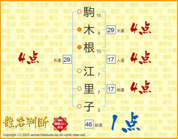 駒(15画)木(4画)根(10画)  江(7画)里(7画)子(3画)