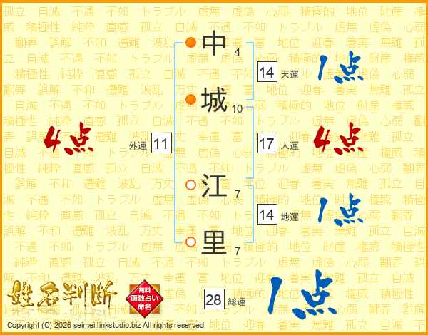 生活面を象徴する運勢です。外部から受ける影響力を表し、結婚運、家庭運や職場、環境への順応性を表します。総運から人運を引いた画数。姓や名が1文字の場合を除く。