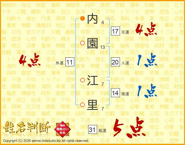 生活面を象徴する運勢です。外部から受ける影響力を表し、結婚運、家庭運や職場、環境への順応性を表します。総運から人運を引いた画数。姓や名が1文字の場合を除く。