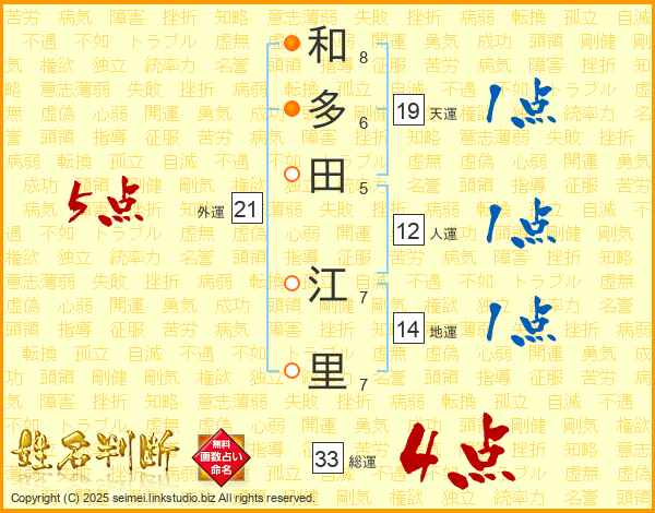 和(8画)多(6画)田(5画) 江(7画)里(7画)