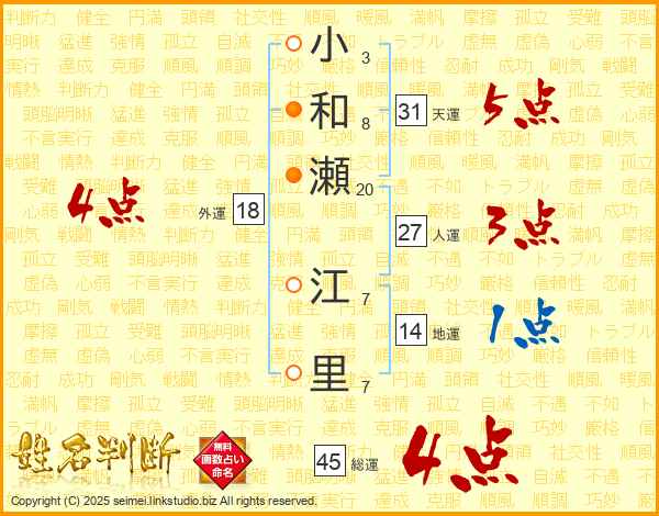 小(3画)和(8画)瀬(20画) 江(7画)里(7画)