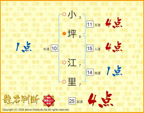 生活面を象徴する運勢です。外部から受ける影響力を表し、結婚運、家庭運や職場、環境への順応性を表します。総運から人運を引いた画数。姓や名が1文字の場合を除く。