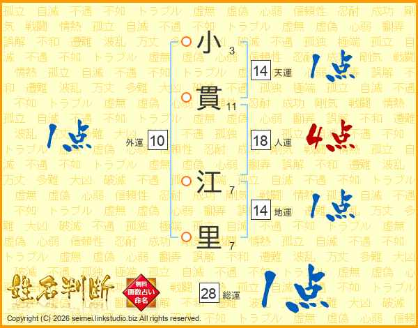 小(3画)貫(11画) 江(7画)里(7画)