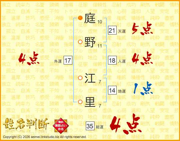 庭(10画)野(11画) 江(7画)里(7画)