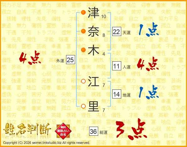 津(10画)奈(8画)木(4画) 江(7画)里(7画)