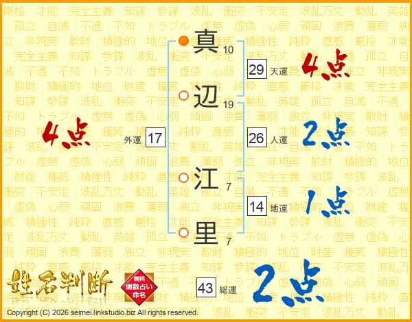 生活面を象徴する運勢です。外部から受ける影響力を表し、結婚運、家庭運や職場、環境への順応性を表します。総運から人運を引いた画数。姓や名が1文字の場合を除く。