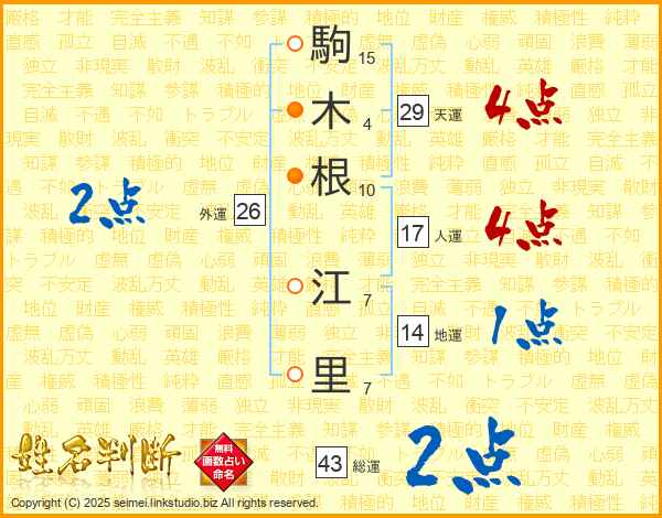駒(15画)木(4画)根(10画) 江(7画)里(7画)