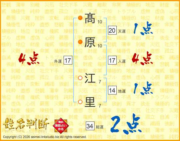 髙(10画)原(10画) 江(7画)里(7画)