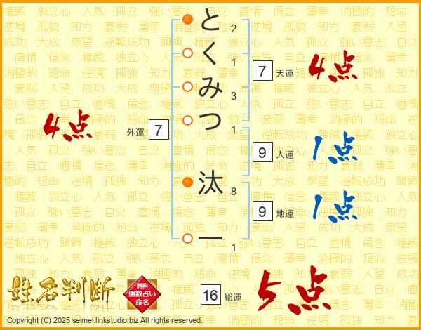 とくみつ汰一さんの総運は16画の5点!
