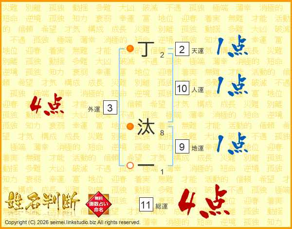 生活面を象徴する運勢です。外部から受ける影響力を表し、結婚運、家庭運や職場、環境への順応性を表します。総運から人運を引いた画数。姓や名が1文字の場合を除く。